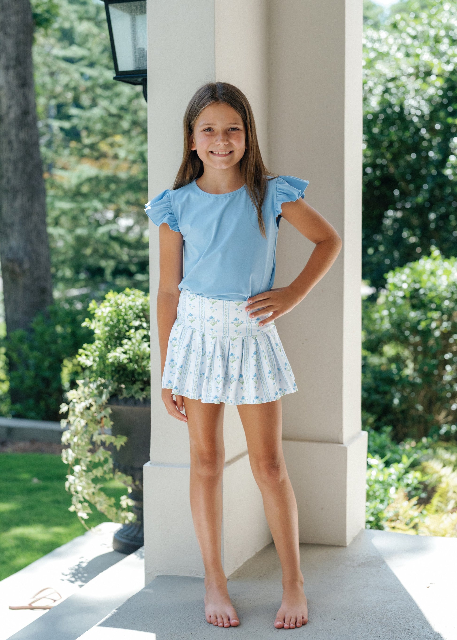 Sweet, simple, and perfect for sunny days — the Collins Set in Blue Trellis is an effortlessly charming outfit for girls on the go. Featuring a soft, sky-blue flutter-sleeve top and a coordinating pleated skirt in a dainty floral stripe pattern, this set brings together comfort and timeless style.