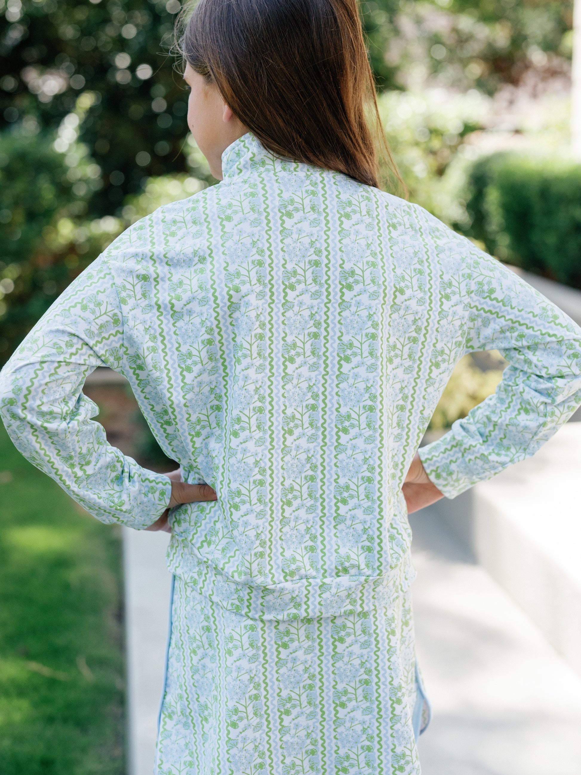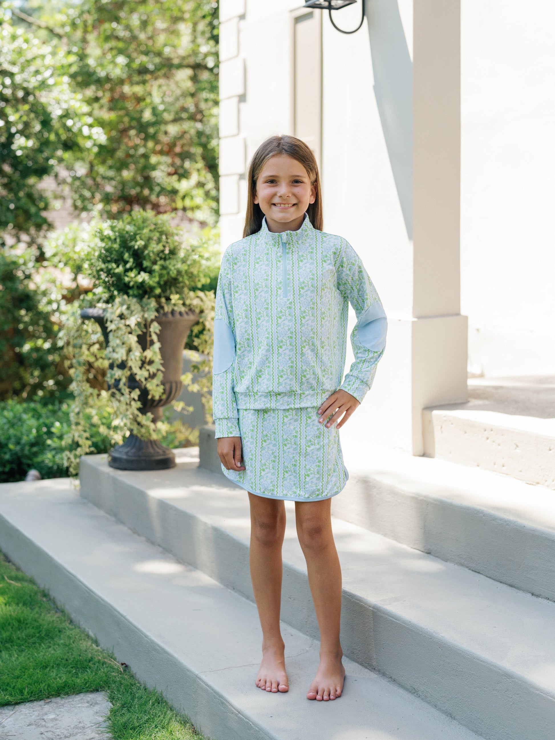 Turn heads on and off the court with the Charlotte Set in Garden Rio by Evelyn Henson. Designed with movement, comfort, and confidence in mind, this two-piece set features a playful quarter-zip pullover and a coordinating athletic skirt — perfect for school, sports or weekend adventures.